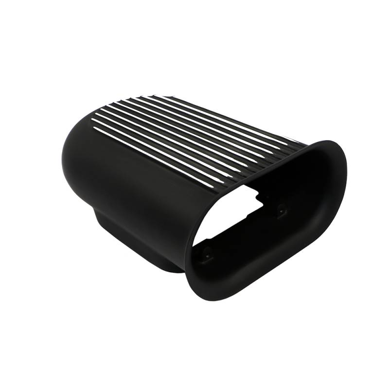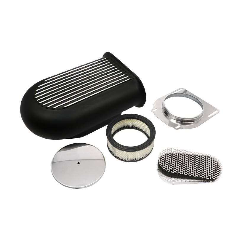 This is a complete black powder coated aluminum finned air scoop kit. Retro Hilborn style for single 4 barrel carbs with 5 1/8" neck including most Holley, Edelbrock, Rochester, and Carter carburetors.