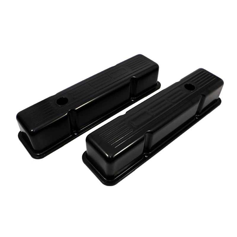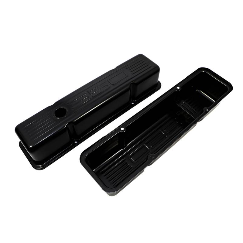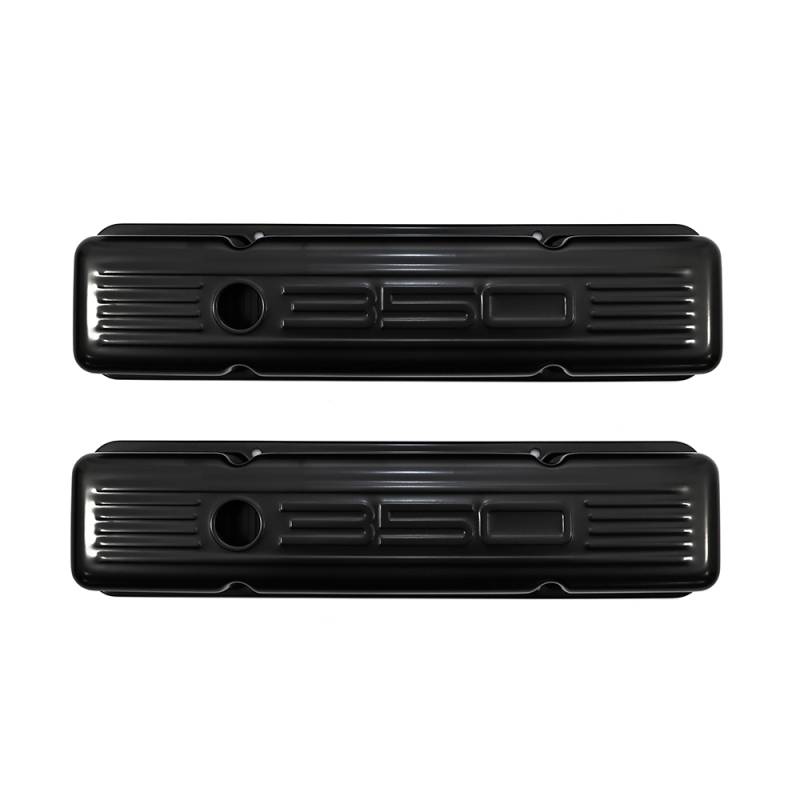 This is a new pair of black steel "350" logo valve covers. Fits 1958-1986 small block Chevys. Tall version - 3 5/8" height with baffled breather holes. Uses Grommet Kit A.