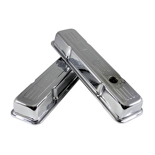 This is a new pair of chrome steel "350" logo valve covers. Fits 1958-1986 small block Chevys. Short version - 2 5/8" height with baffled breather holes. Uses Grommet Kit A.